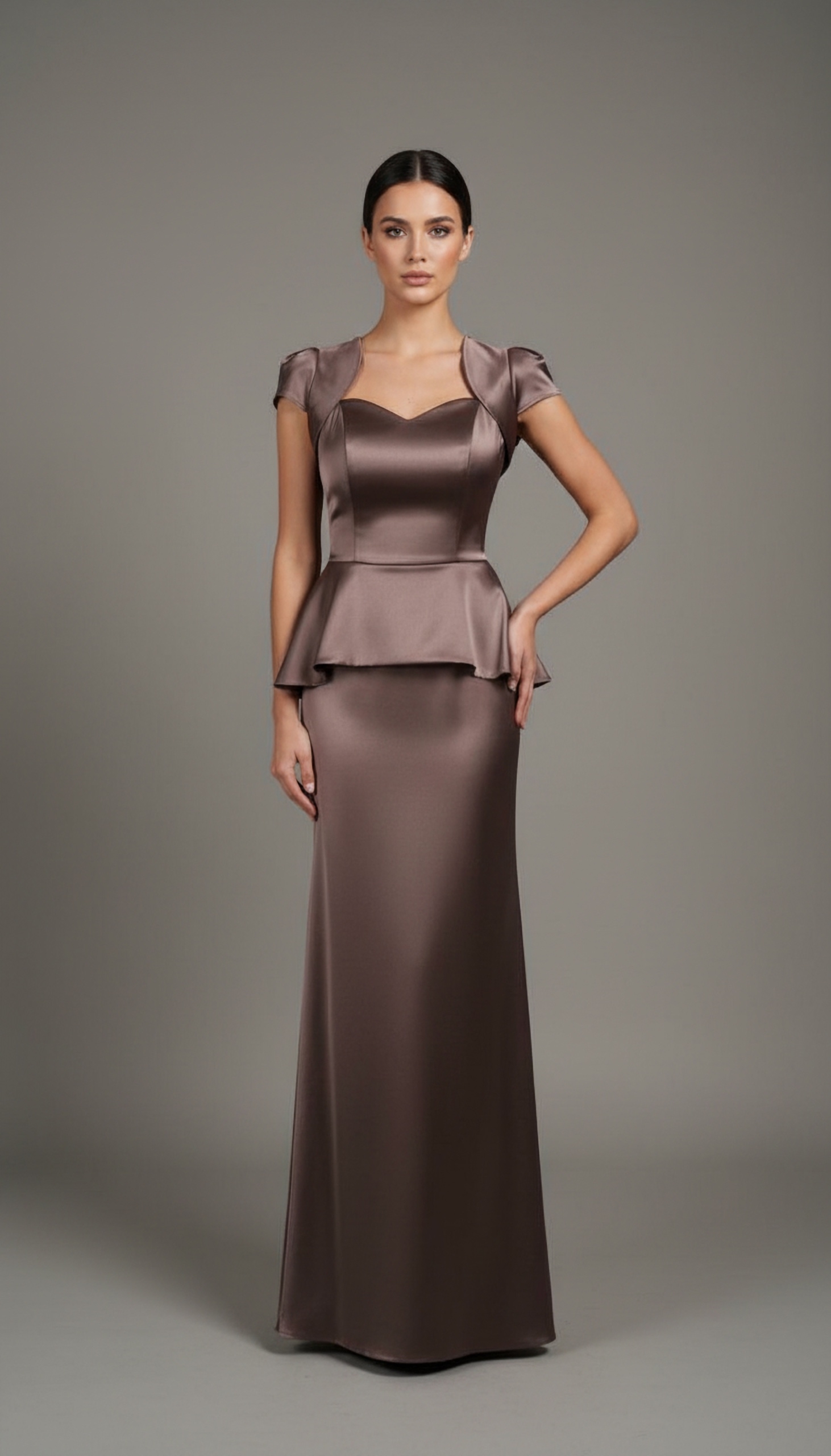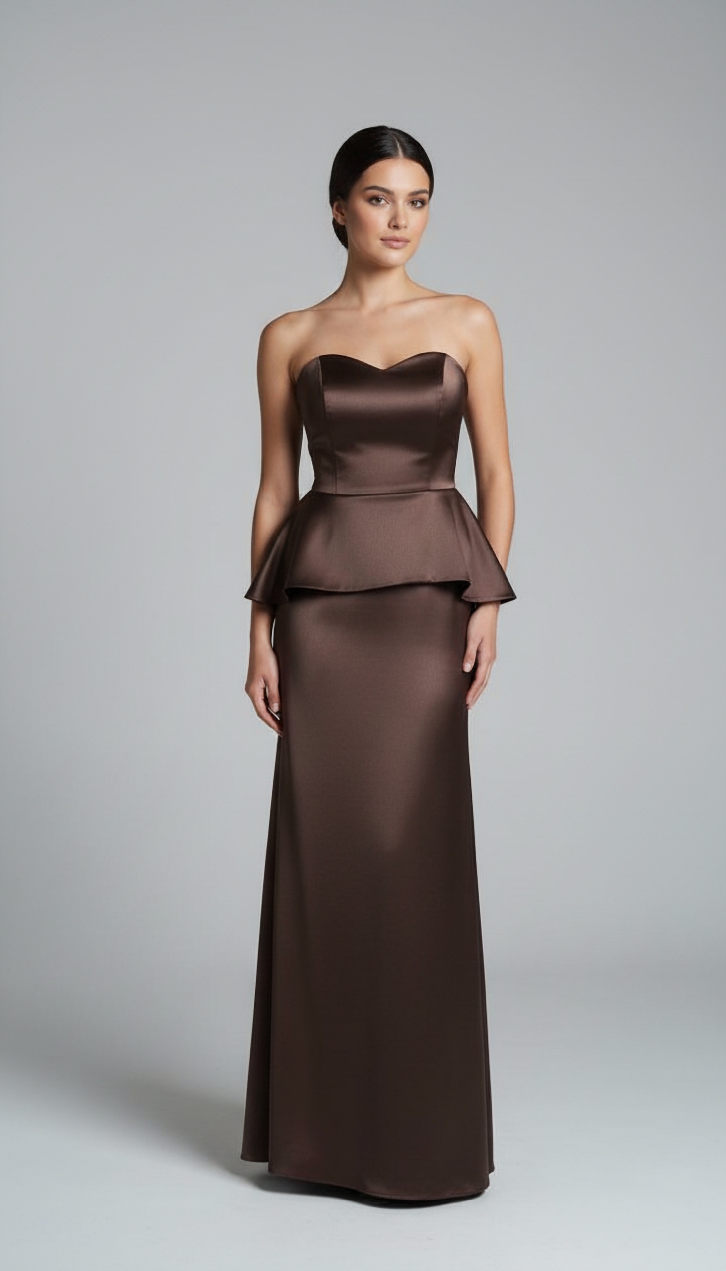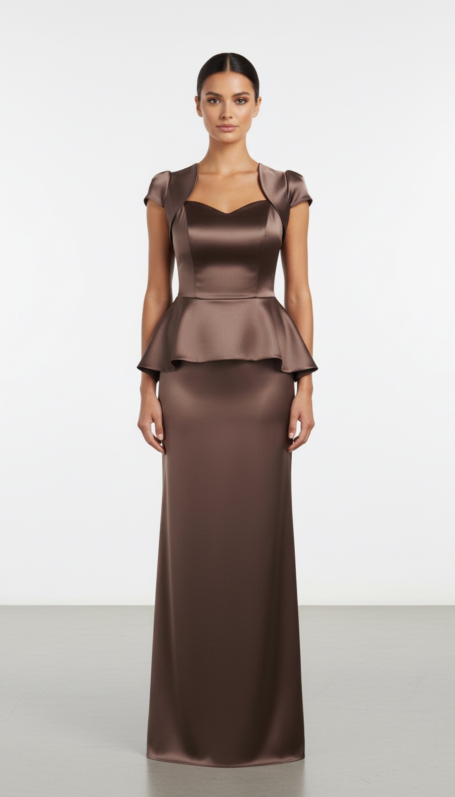 На изображении представлено элегантное вечернее платье, выполненное из атласа. Платье имеет облегающий силуэт, который плавно переходит в расклешенную юбку.