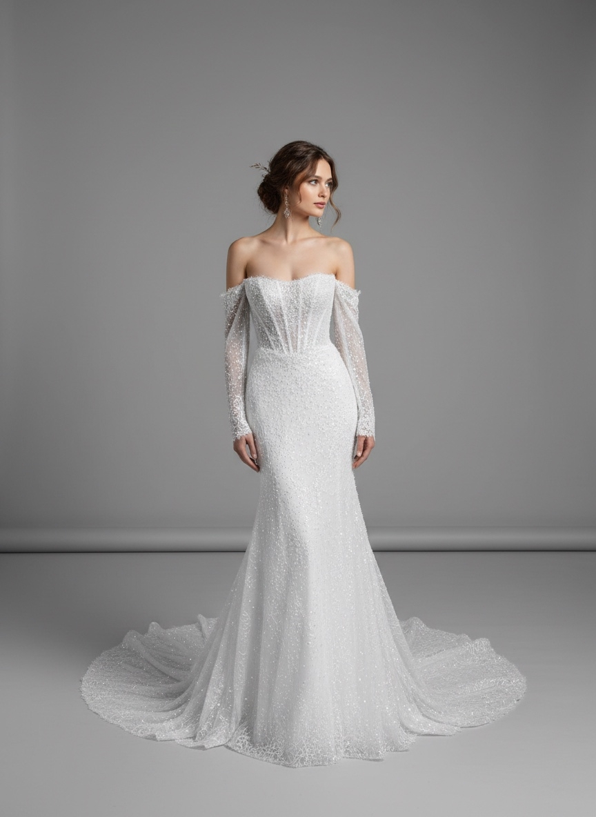 Платье расшито кружевом и жемчугом . Размер 42 . Рукав съёмный .